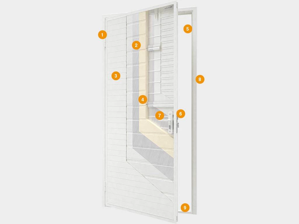 Наличие в составе конструкции термоэластопластичного уплотнителя позволяет сохранить в помещении комфортную температуру. Для внешней обшивки использован алюминиевый профиль DHOP-01. Стандартно двери окрашиваются в коричневый, красно-коричневый или белый цвет. Опционально возможна окраска в любой цвет по карте RAL.